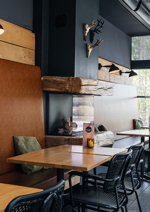 Vanaf het begin was het uitgangspunt helder: een plek creëren waar iedereen zich prettig voelt. Voor koffie in de ochtend, een lange lunch of een borrel met vrienden. De materialen zijn natuurlijk en warm, de sfeer relaxed maar verzorgd. Door met verschillende houttonen, zachte stoffen, keramiek en een kleurenpalet geïnspireerd op het landschap buiten te werken — grijsgroen, zand, warm hout, zwart als accent — kreeg het interieur een rustige basis die altijd klopt.